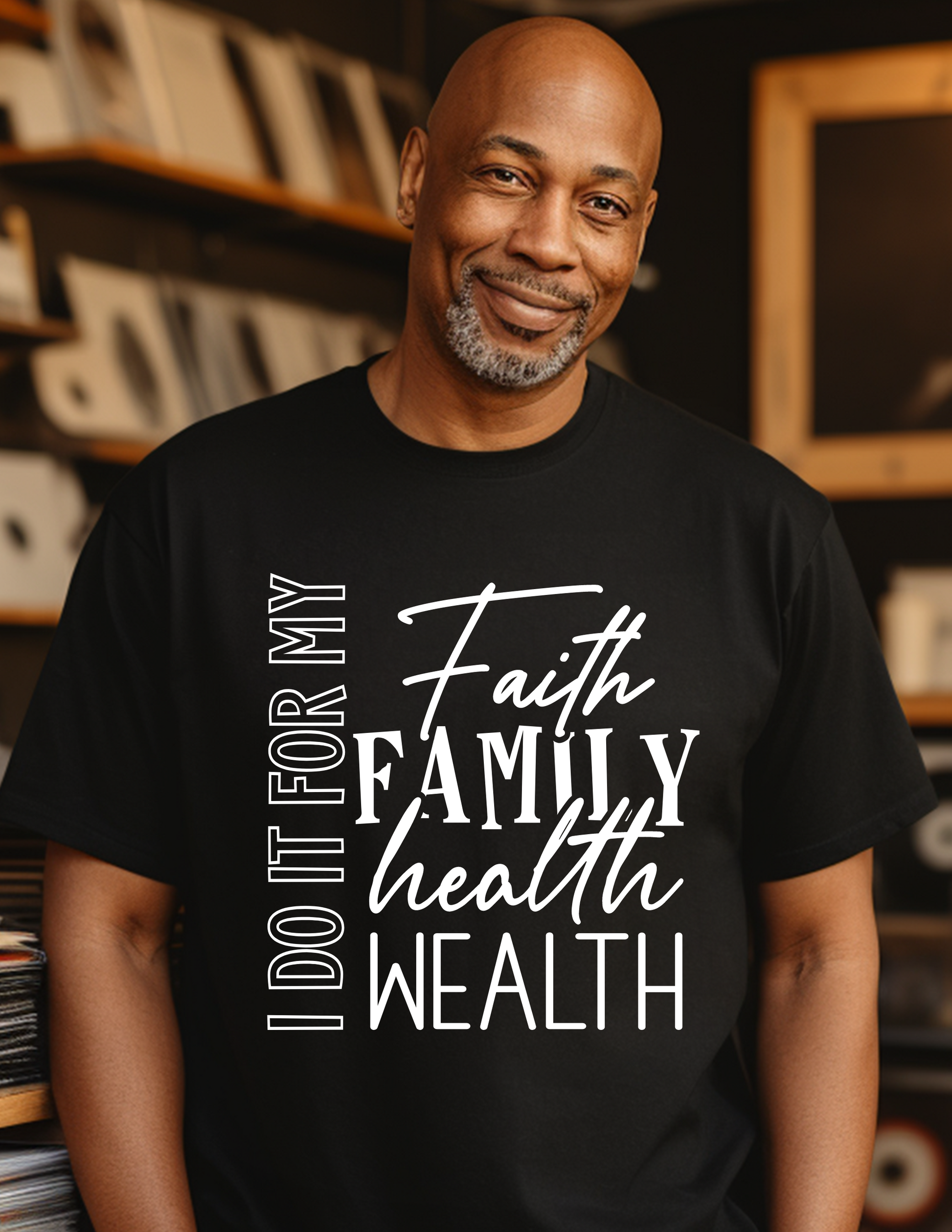 Our "Faith, Family, Health, Wealth" T-Shirt—a celebration of life's essential pillars encapsulated in a stylish and meaningful design. This shirt beautifully merges faith-based values with everyday priorities, offering a visual reminder of what truly matters.