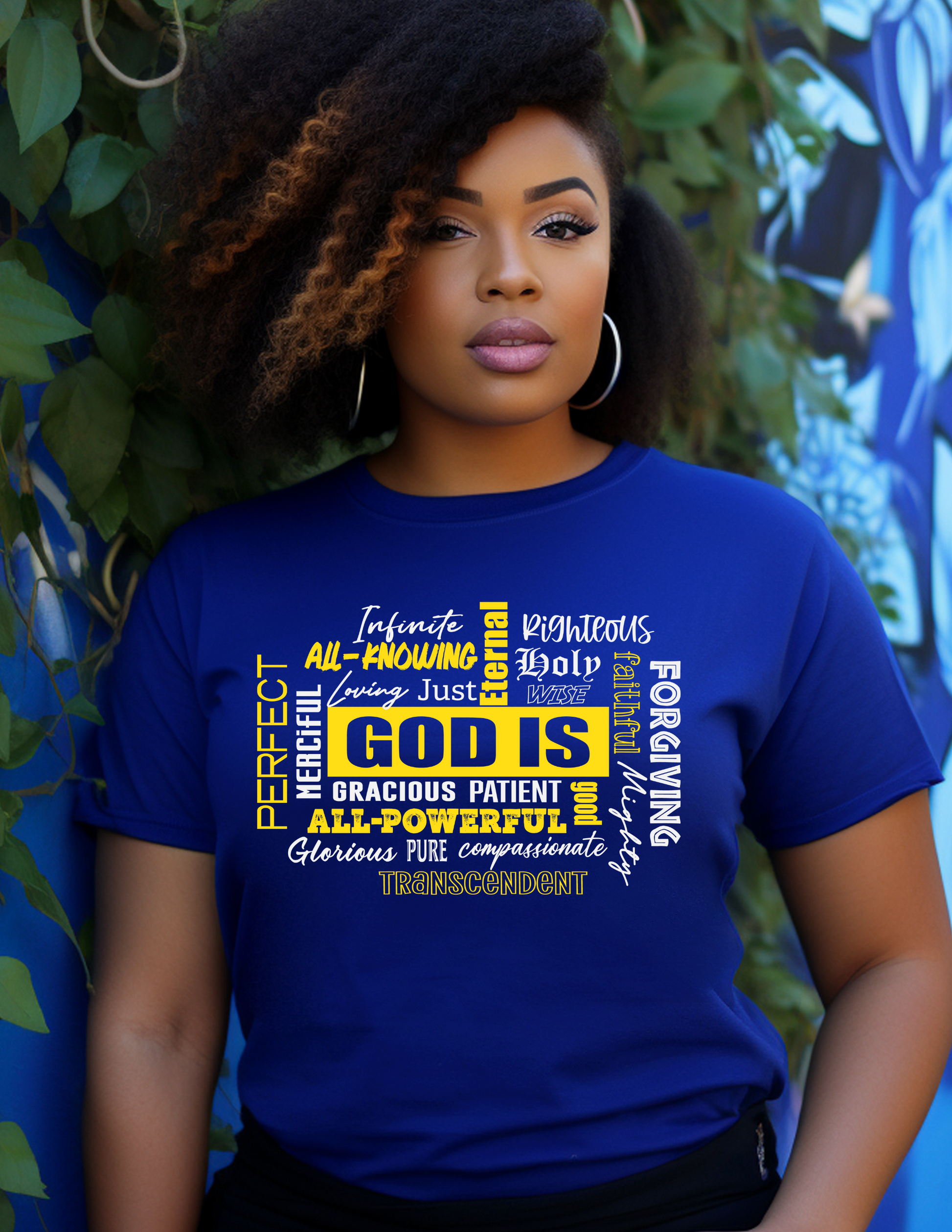 This t-shirt serves as a reminder and an invitation—to contemplate the profound nature of God and to celebrate His presence in our lives. Whether worn as a personal affirmation of faith or as a gift to inspire others, the "God Is" T-Shirt invites wearers to embrace and reflect on the divine attributes that bring meaning and purpose to life.